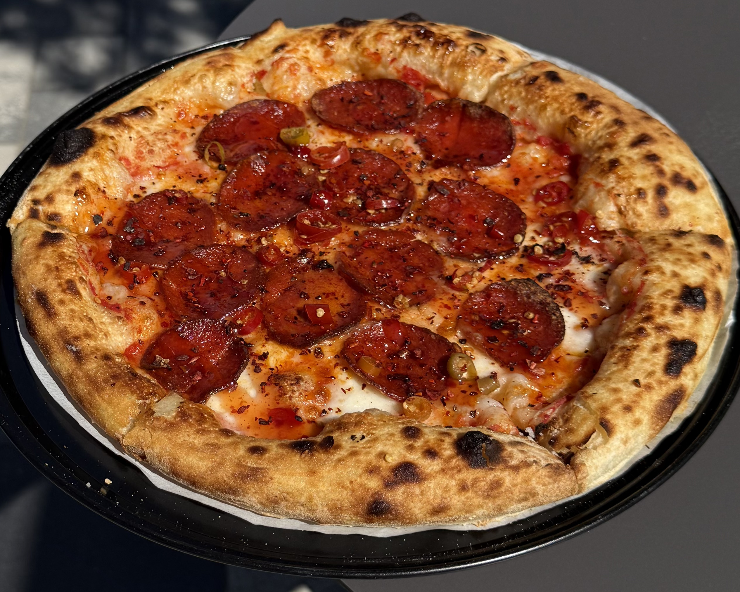 томатний соус, салямі діабола, крафтова моцарела, гострий чілі, світ чілі, сушені томати, часникова олія 520гГостра!