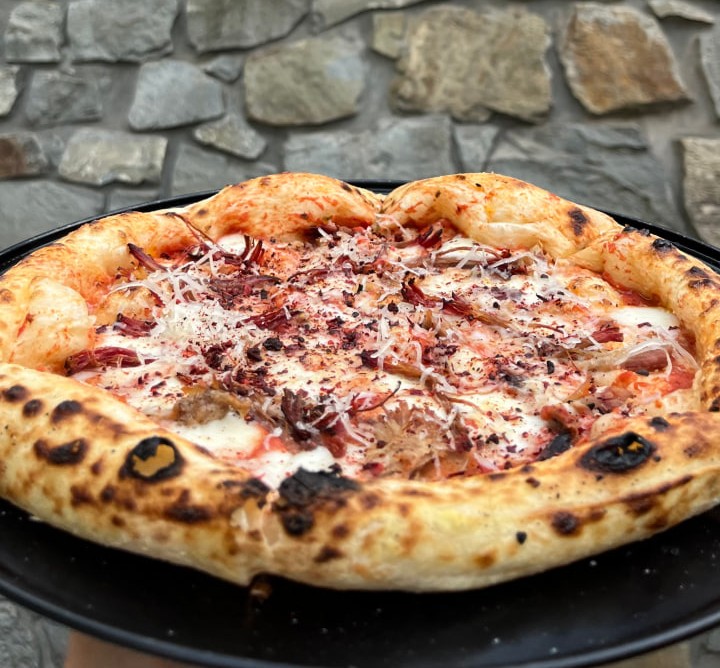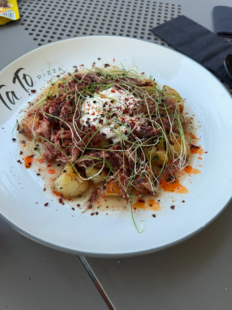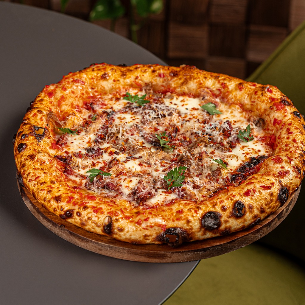 томатний соус, крафтова моцарела, шия яловича, рвана свинина, гауда, петрушка, часникова олія 500 г