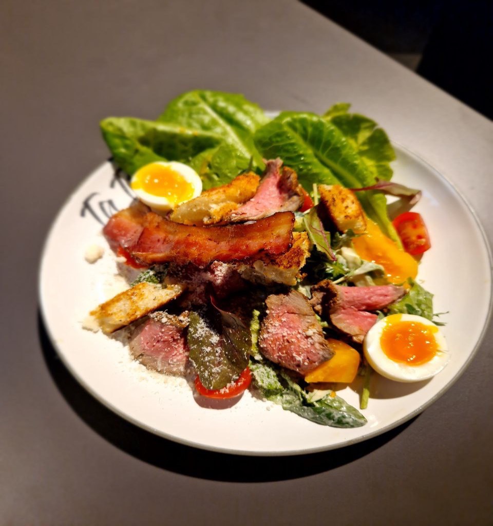 мікс салату, ростбіф, томати чері, гауда, чіпси бекону, сухарі, соус цезар