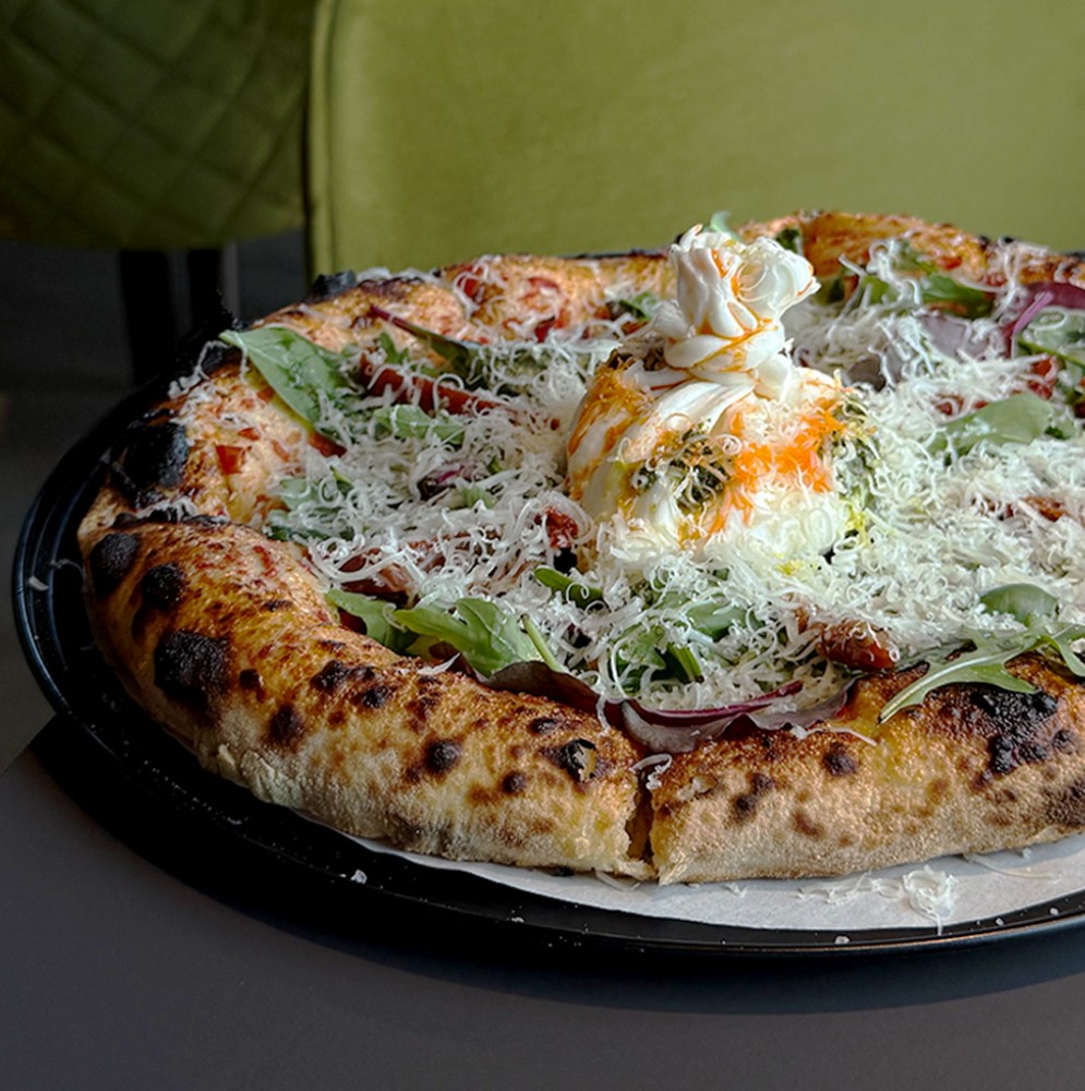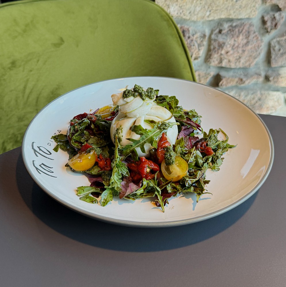 томатний соус, крафтова бурата та моцарела, мікс салату, соус песто, в'ялені томати, яловича шия, часникова оліяОрієнтовний вихід страви - 670 г