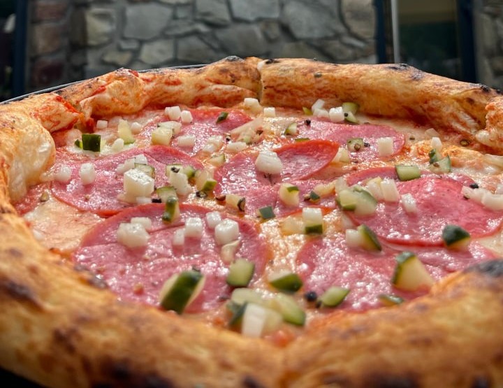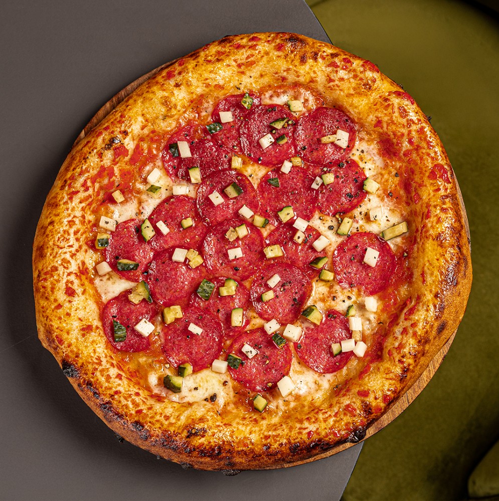 томатний соус, крафтова моцарела, салямі, мариновані огірки, пекоріно, базилік, часникова олія 520 г