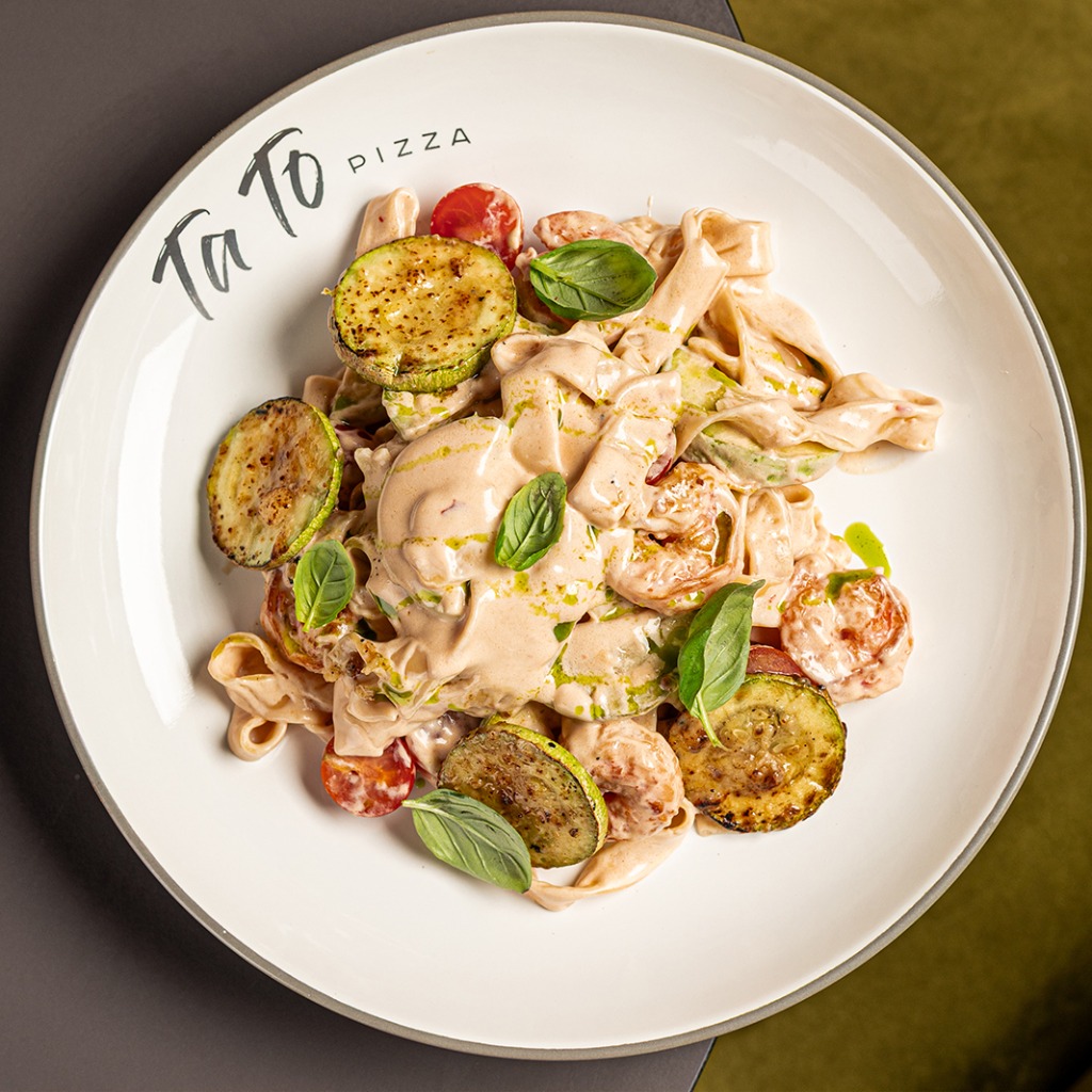 фетучіні, креветки, кабачок, часник, вершки, томати чері, гауда 340 г