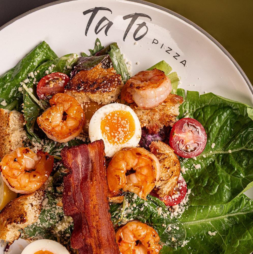 салат ромен, креветки, томати чері, гауда, чіпси бекону, сухарі, соус цезар