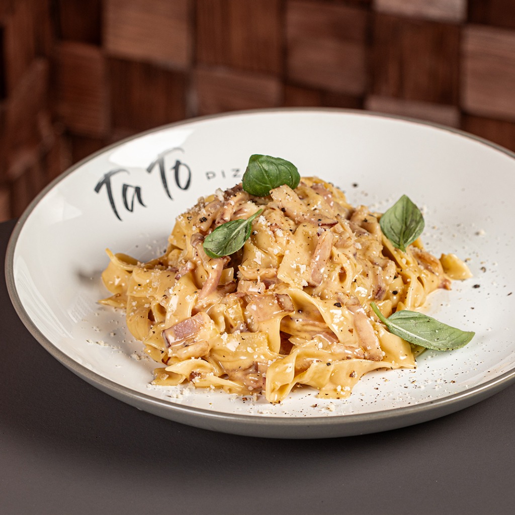 фетучіні, вершки, гауда, бекон, жовток, соус на основі вина 300г