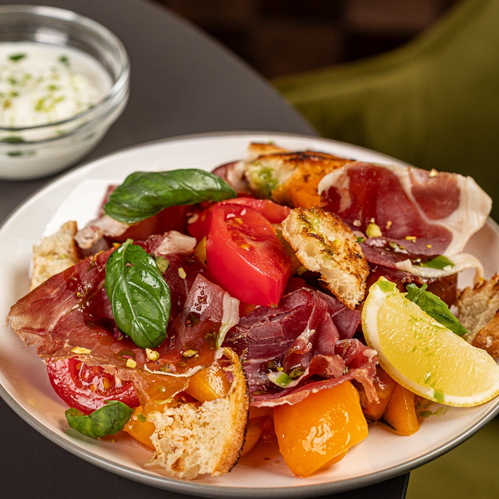томати рожевий, чорний, жовтий , чері, крутони, прошуто, страчатела базилік