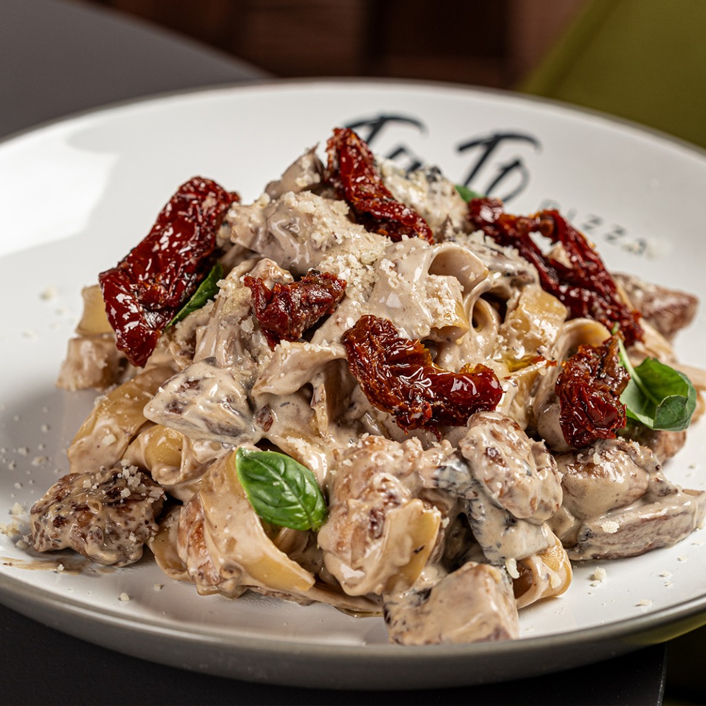 фетучіні, курка, цибуля, печериці, вершки, в’ялені помідори, гауда, базилік, фісташка